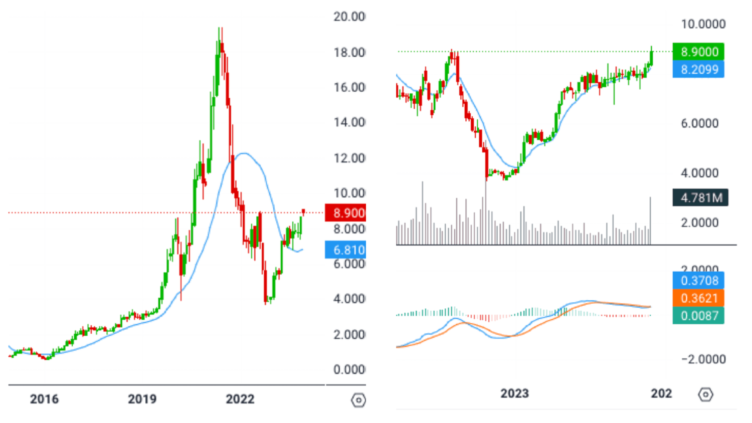 The monthly chart on the left shows the stock currently trading above the 21 monthly exponential moving average. You’ll notice that when the stock had it’s incredible rally from 2016 onwards it was also trading above the blue line (21ema).
